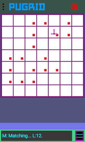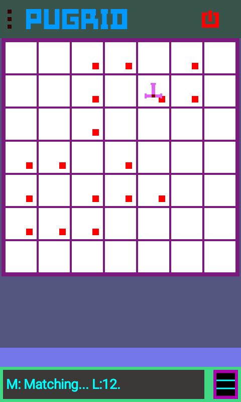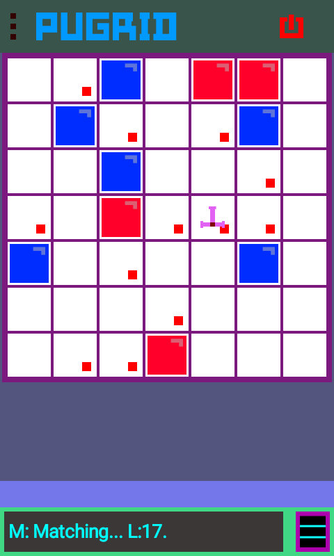 Pugrid (short for Pure grid) is a 7x7 grid logic puzzle for single player. The puzzle consists of two modes: Clearing and Matching where the second mode is said to be more strategic skill in solving when playing in difficult level.